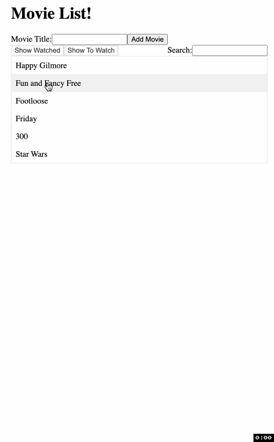 By the end of the week, we had built a Movie List app that grabs movie data from TMDB api and renders information in an accordion-style list. Some features are that the list is searchable, the user can add movies to the list (which is then persisted in a mysql database), and the user can mark movies as watched or not. After writing the http server from scratch, getting to use Express was so nice!