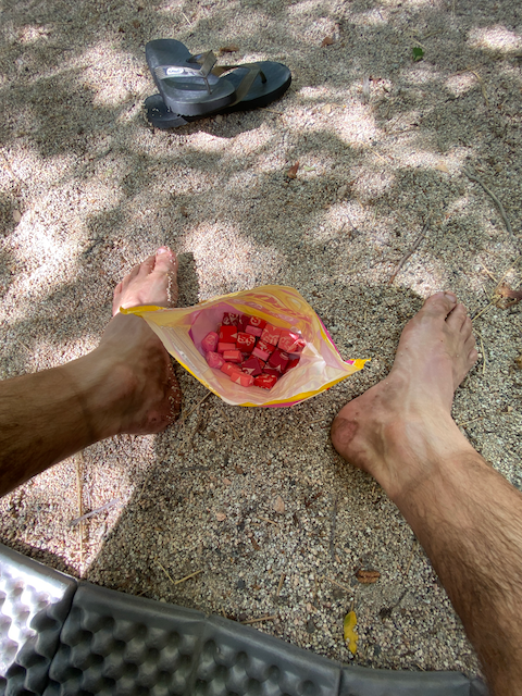 The most obvious answer is that I need to get better at resting. Fourteen or more hours per day on foot has been a shock and my feet have responded by ballooning with inflammation and bubbling over with blisters. I’m still a bit surprised since I put in a lot of hours on foot training, running an hour or two most days, and had zero foot problems in the six months leading up to my hike. Shouldn’t that be enough repetitive stress? Turns out the answer for me is a solid NOPE. Write it with a Sharpie on my forehead or something. I need to remember this feeling if my trail aspirations are to survive.