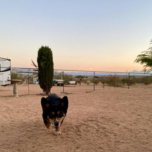 Benny the Corgi lives with my second cousin in Apple Valley, a rural residential community outside Victorville. He and I are in the backyard under the shade of an awning, which protects us from the raging sun blasting the valley to a temperature over 100 degrees. Even in the shade we’re sweating. I’m wearing a tank top, shorts, and sunglasses, soaking my feet in ice water, and drinking the same. Benny is belly down on the pavement, legs butterflied like a splacthcock chicken on the grill. His shaggy black coat begs for pets.