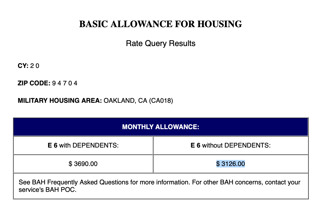 To find this amount, you first need to go to the Defense Travel Management Office BAH Calculator. Your duty zip code will be where you live, for this example 94704 for UC Berkeley, and Pay Grade will be E-6. Press 'calculate' and a new window should appear that looks like this: