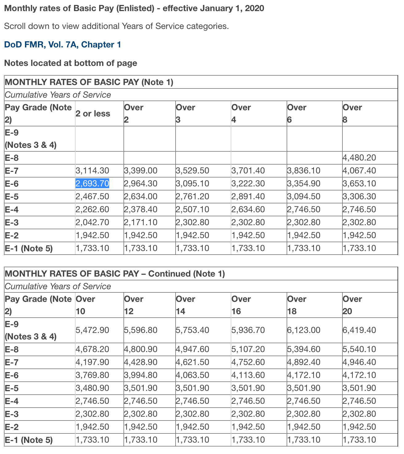 Every year, DFAS (Defense Finance and Accounting Service) puts out Military Pay Tables and Information. Following that link, I click on the link for "Enlisted Members (Posted Dec. 2019)". This table shows pay grade (i.e. rank) on the left hand column with lowest rank at the bottom, E-1, or "Seaman Recruit," up to the ghiest, E-9, or "Master Chief Petty Officer". The top row has Years of Service where "2 or less" means "less than 2 years of service" or "Over 4" means "more than four years of service." For a brand new NUPOC student, find the number that corresponds to E-6 and "2 or less," which in this case is $2693.70 (see highlight in image below).