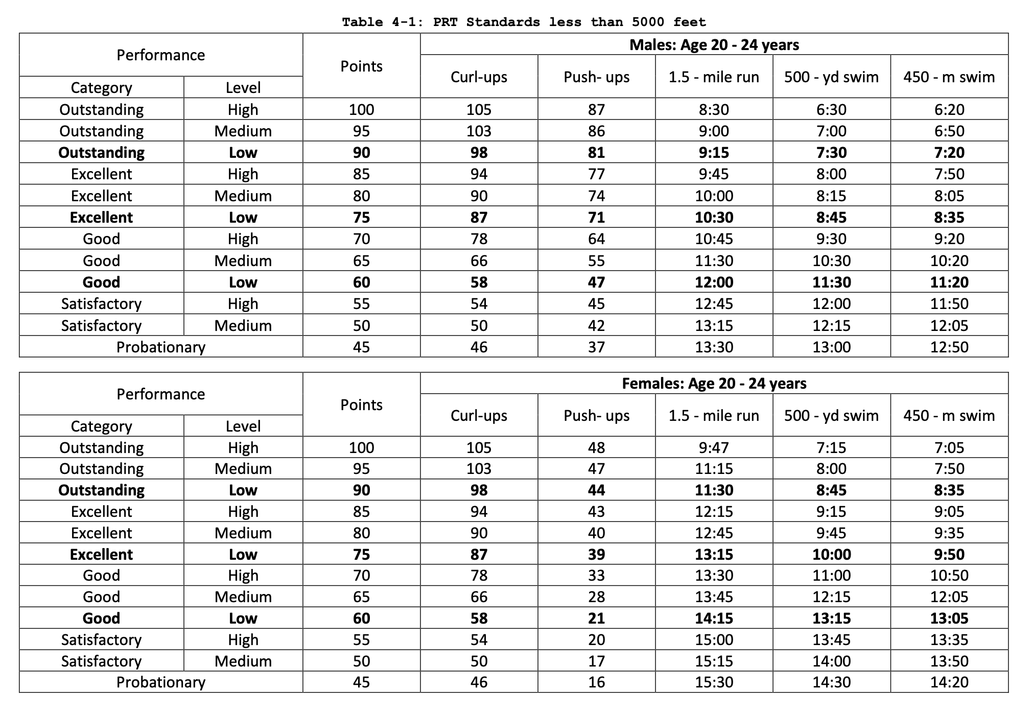 The next day you will perform the PRT. First you must perform maximum number of curl-ups (sit ups) within 2 minutes, then rest, then maximum number of push-ups within 2 minutes (resting only in the "up" position), then rest, then run a mile and a half. You must score above the probationary tier to pass. Note that the below tables are divided male/female and for individuals 20-24 years old. As you get older, the targets become softer. Additionally, if you score an overall Excellent Low or better, you are eligible to "validate" your next test such that you only run the PRT once per year (you must still pass the BCA twice per year). Validating your PRT does not in anyway affect your performance evaluations and is a way for the Navy to cut down on the logistical burden of administering the tests.