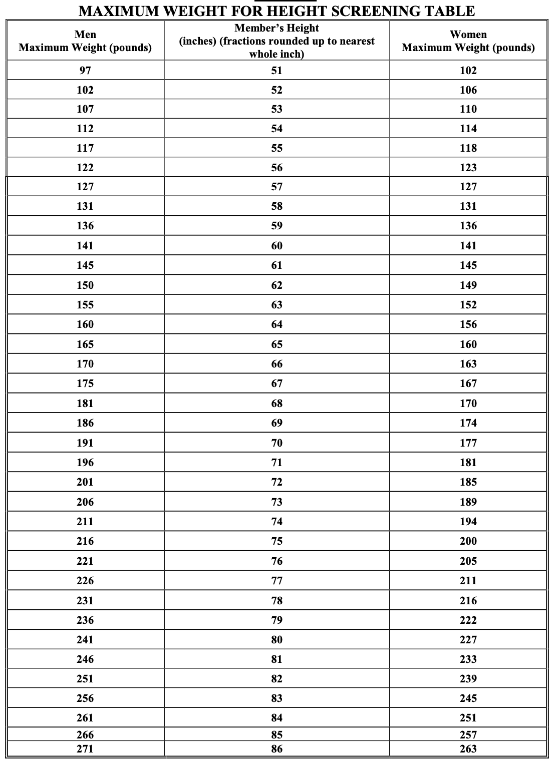 The semi-annual Physical Fitness Assessment (PFA) encompasses both the Body Composition Analysis (BCA) and Physical Readiness Test (PRT). Requirements are different depending on your age and sex, but the test is the same across the board. The day before is the BCA where you are required to "weigh in" and measure your height. Maximum weights are given for each height, but if you exceed that, you may still qualify if you are under the maximum Body Mass Index (BMI) standard for your age.