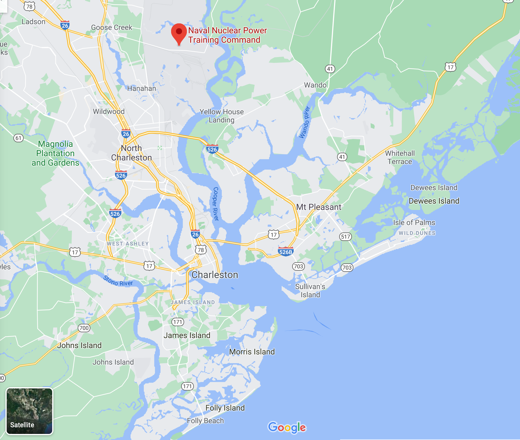 NNPTC is actually located about 30 minutes north of Charleston in Goose Creek (see map below). As an officer, you will live "off-base" such that you will need to locate your own housing while living there. Typically officers live in Charleston proper, Mt. Pleasant, and James Osland though some folks live as far as Isle of Palms and Folly Beach. My personal recommendation? Enjoy the Charleston city life. There's lots of great bars and restaurants there, the commute is manageable, and the beach is a short drive away.
