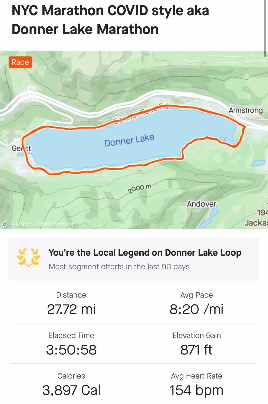 Anyways, let's break to the actual marathon. I chose Donner Lake because the loop is a predictable 7 miles with minimal elevation change. It's close to the cabin and I could park my truck on the side of the road and easily utilize it as an aid station. I tested the loop on Oct 26 and felt confident it would be a good location. Oh, it's also beautiful to look at.