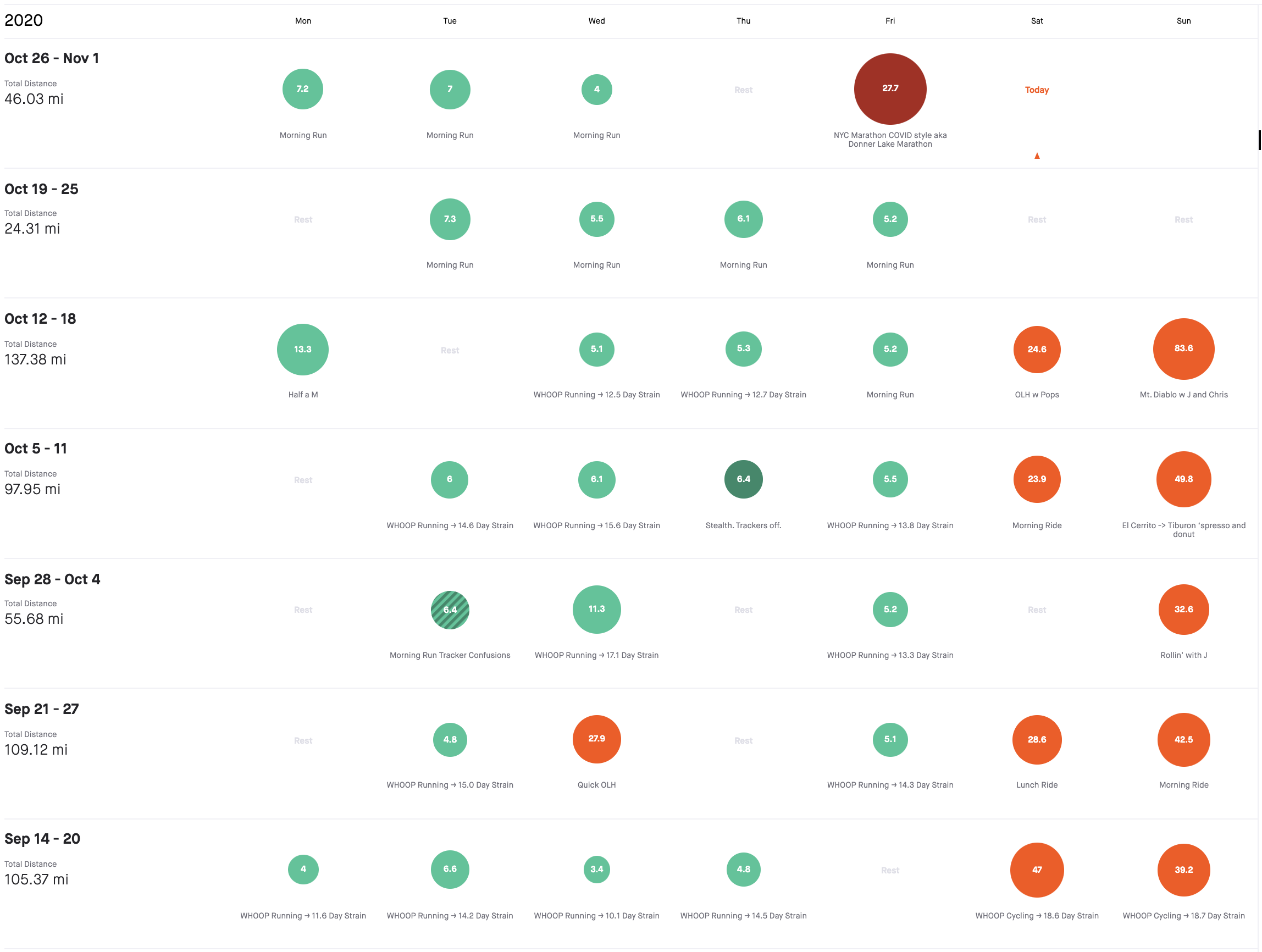 But the NYC Marathon would be different I hoped. I had logged a healthy chunk of miles already and recently felt good after a 13 mile weekend run. Here's my Strava training calendar. It covers the period from Aug 10 to Nov 1, and includes cycling (orange) and running (green).