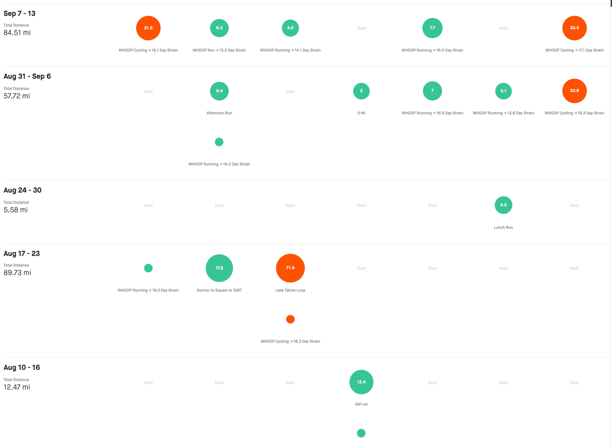- A select few "Big Mile" days kept me mentally engaged in running. See Aug 18 Donner to Squaw 17.8 mile run/hike, Aug 19 bike ride around Lake Tahoe, Oct 12 Half Marathon, and Oct 18 Mt. Diablo ride.