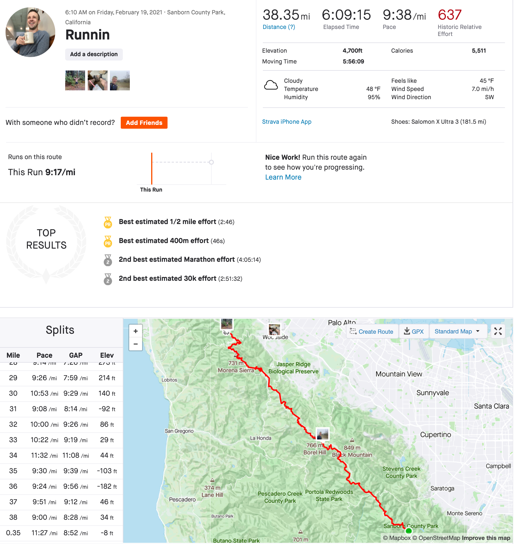 - Miles 26-32 were my dead-zone / pain-cave / see-God miles. I was out of goo (consuming 1 per hour and I had brought 4 with me) and figured I should just tough out the remaining hour even though I had packed emergency peanut butter honey sandwhich. Not sure if it was actually the sandwhich, or an improved mental state from "this sucks" to "I'm actually going to do this", but miles 32-38 were way more enjoyable. Sun also came out a bit and the trail stopped being so steep. So lots of confounding variables, but I will say the PB+H sandwhich didn't hurt me at all!
