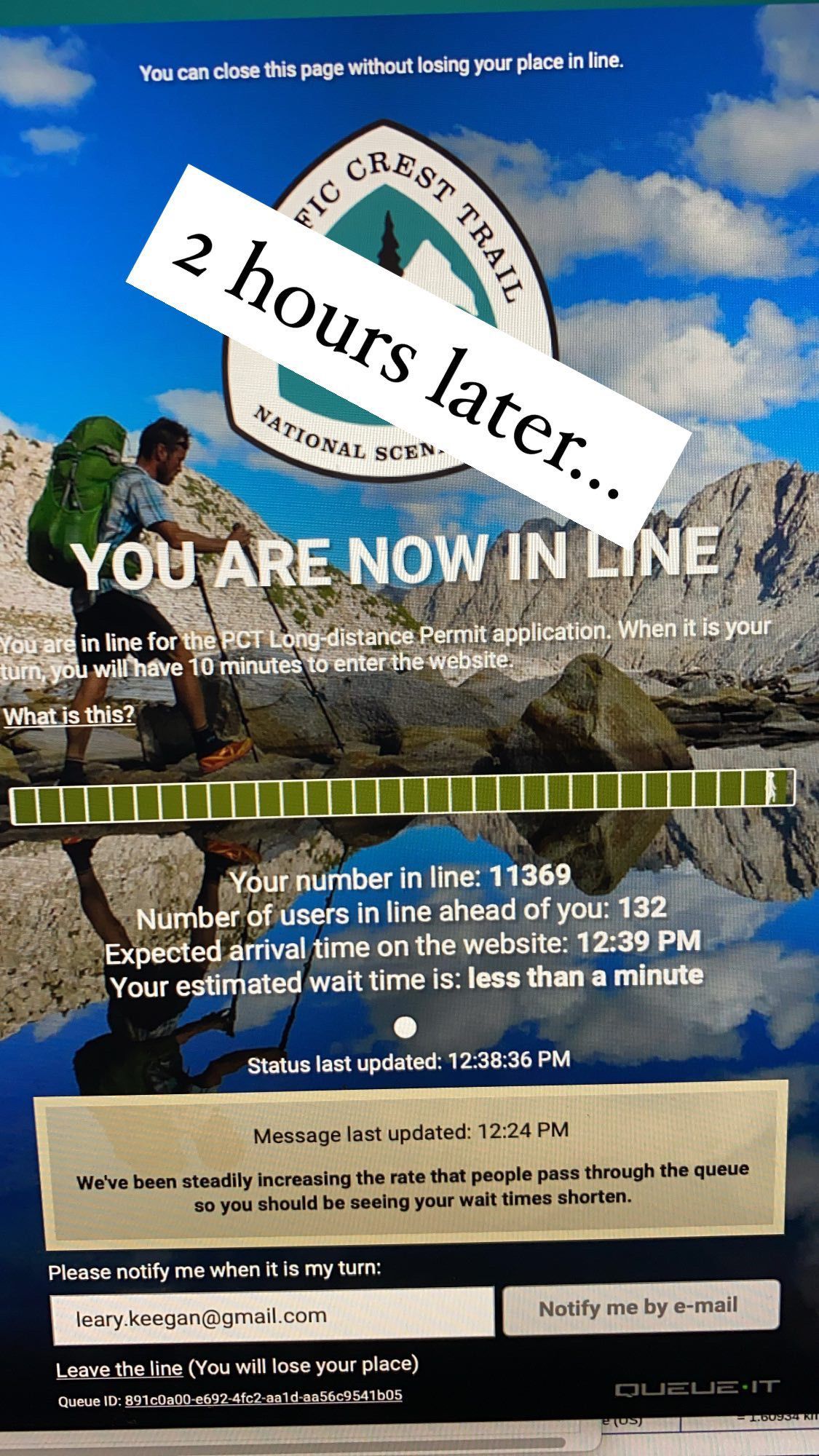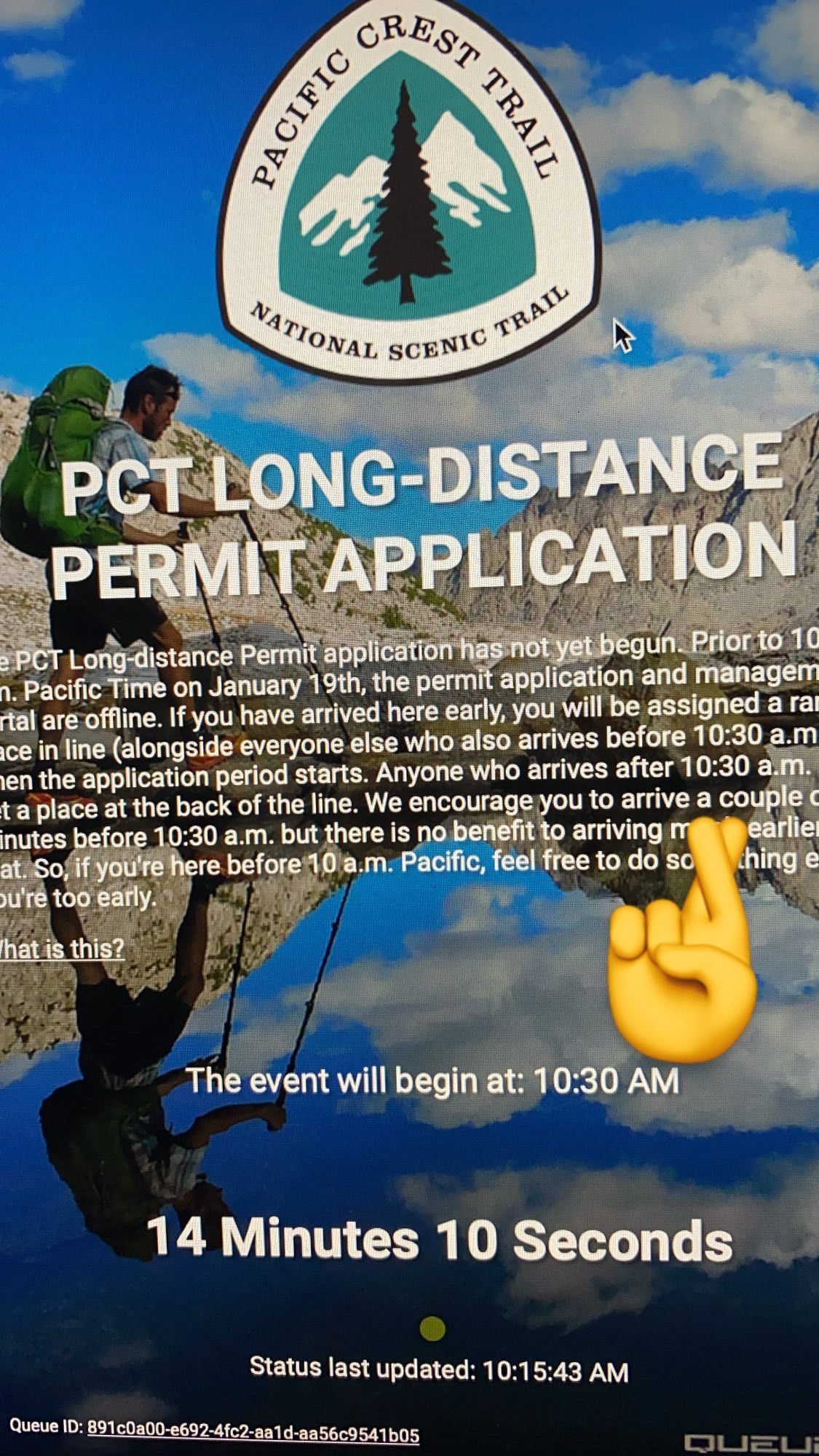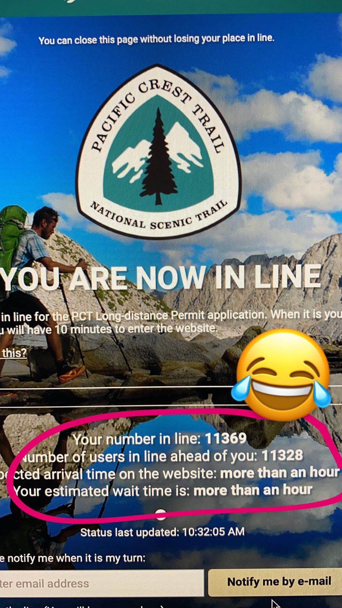 But I stuck around anyways, liked I'd arrived at Disneyland at 1030 on the day after Christmas or something like that, expecting things to go smoothly regardless. The PCTA website DID say wait times could be over 3 hours, so I bunkered down. After an hour, the number of people ahead of me started to decrease much faster, and after a total of two hours, I was in! I clicked through all the clicky things quickly and had my confirmation number. 💪 Who knows what all those other folks were in line for. Perhaps different start locations? Just fluff to test my steel resolve? 😂