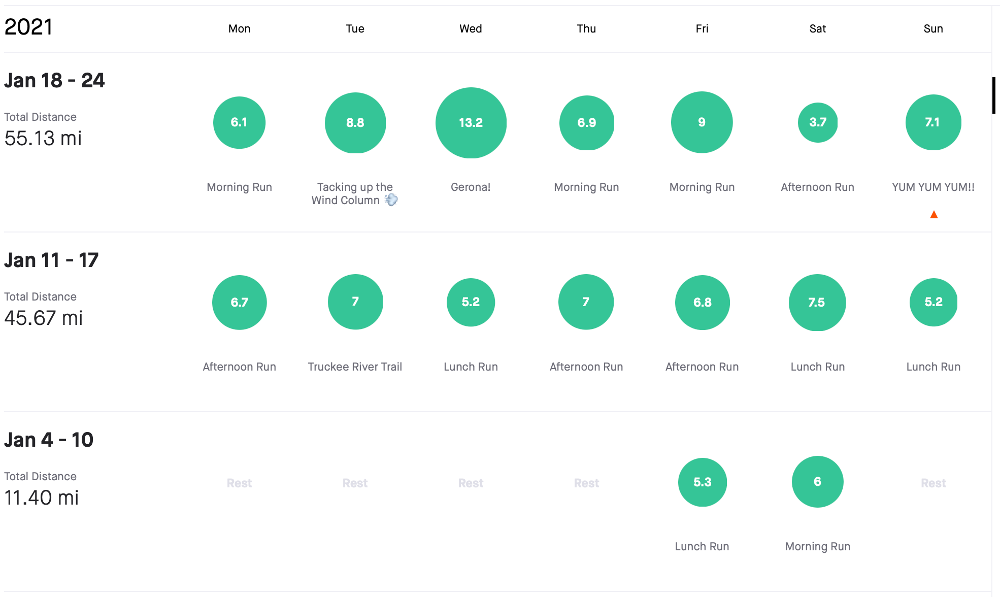 - Running. Despite getting sidelined for 2 weeks from COVID, I was able to climb back up to 50 miles this week and felt AMAZING every day except Saturday (too much booze). I'm excited to be back in to it. Next week may be tough as I'm up in Tahoe now and we've got 6 ft. of snow in the forecast. I may have to trade the runnning shoes for skis a couple days.
